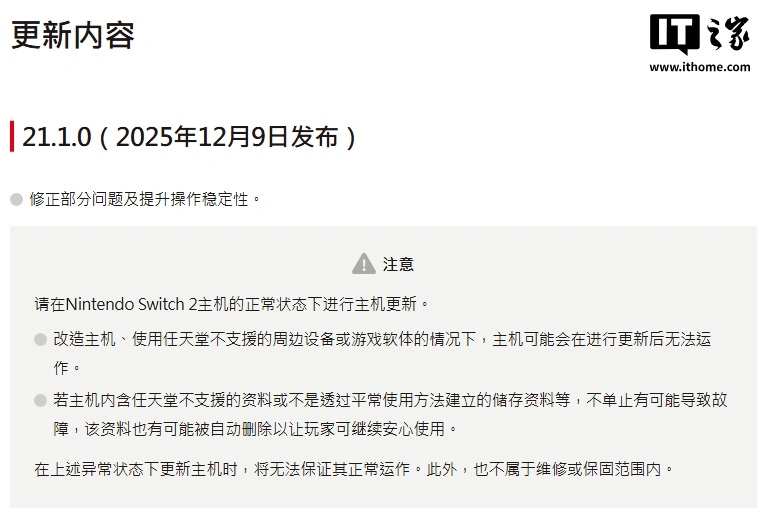 IT之家 12 月 9 日消息,任天堂今日为 Nintendo Switch 及 Switch 2 推送了最新的 Ver. 21.1.0 系统版本更新。
